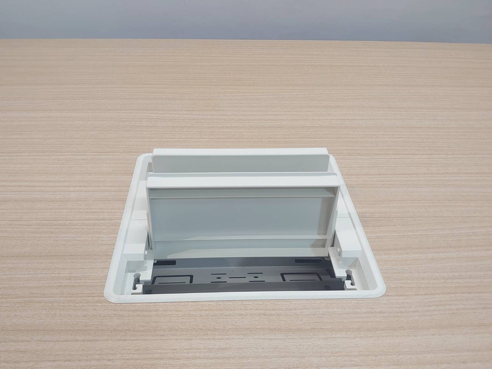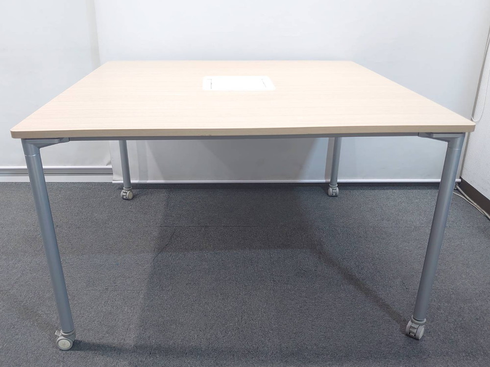 幅1200mm×奥行1200mmの広々とした天板にコードホールを備え、キャスター付きで移動やレイアウト変更も容易です。