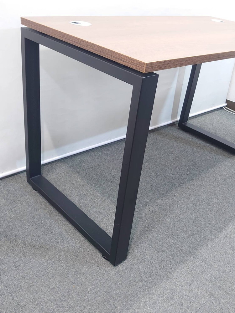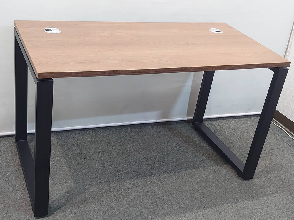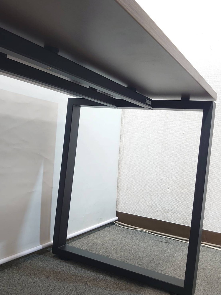 木目ブラウンの天板とブラックフレームの組み合わせが、洗練されたオフィス空間を演出します。