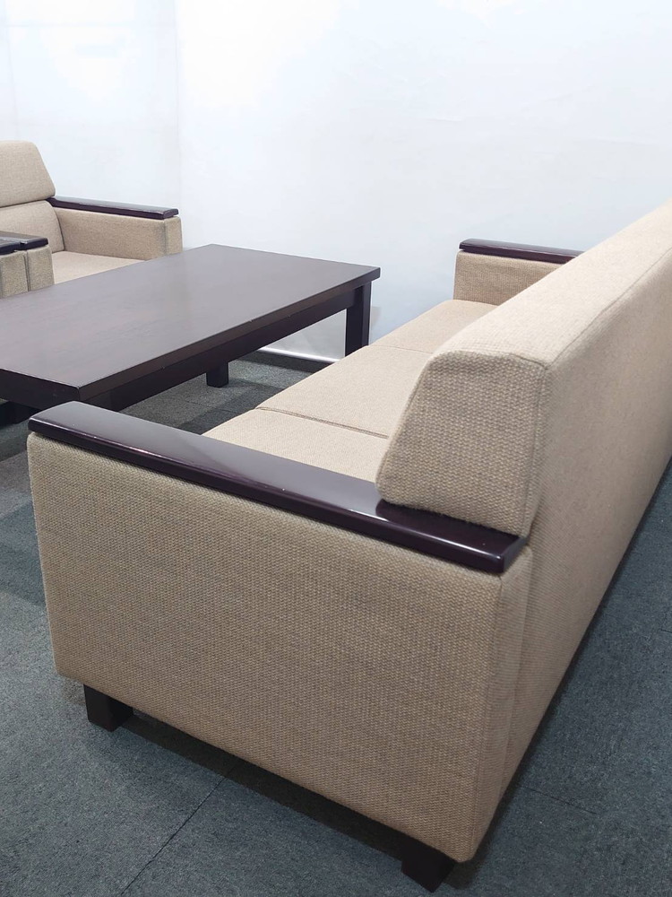 上品なベージュのソファと木目調ローテーブルを組み合わせた、応接家具4点セットです。