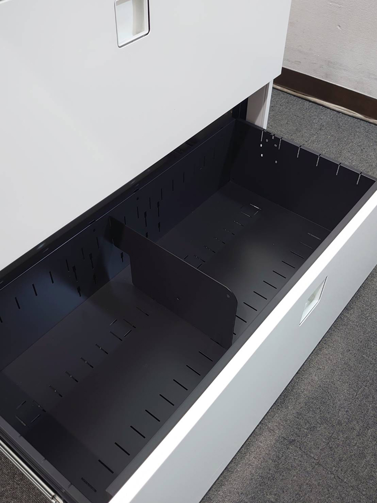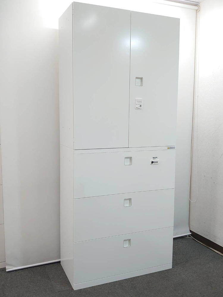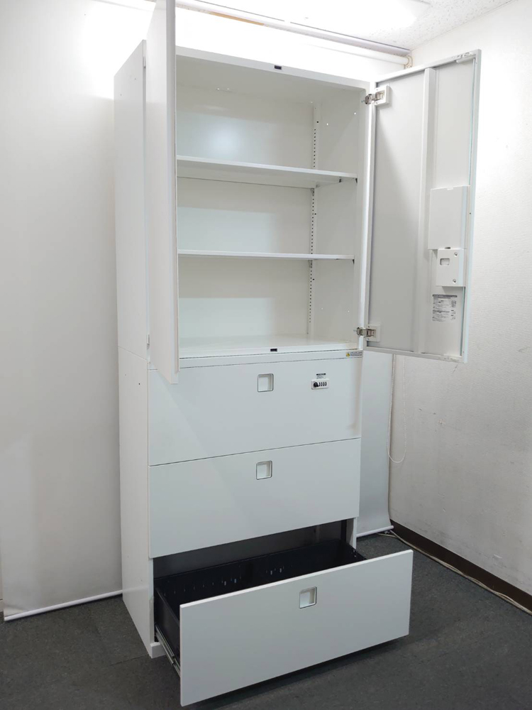 上段はダイヤル錠付き両開き書庫、下段はラテラル書庫仕様で、収納力と機能性を両立しています。