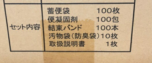 蓄便袋×100枚、便凝固剤×100包、汚物袋(防臭袋)×10枚、結束バンド×100本、取扱説明書×1枚